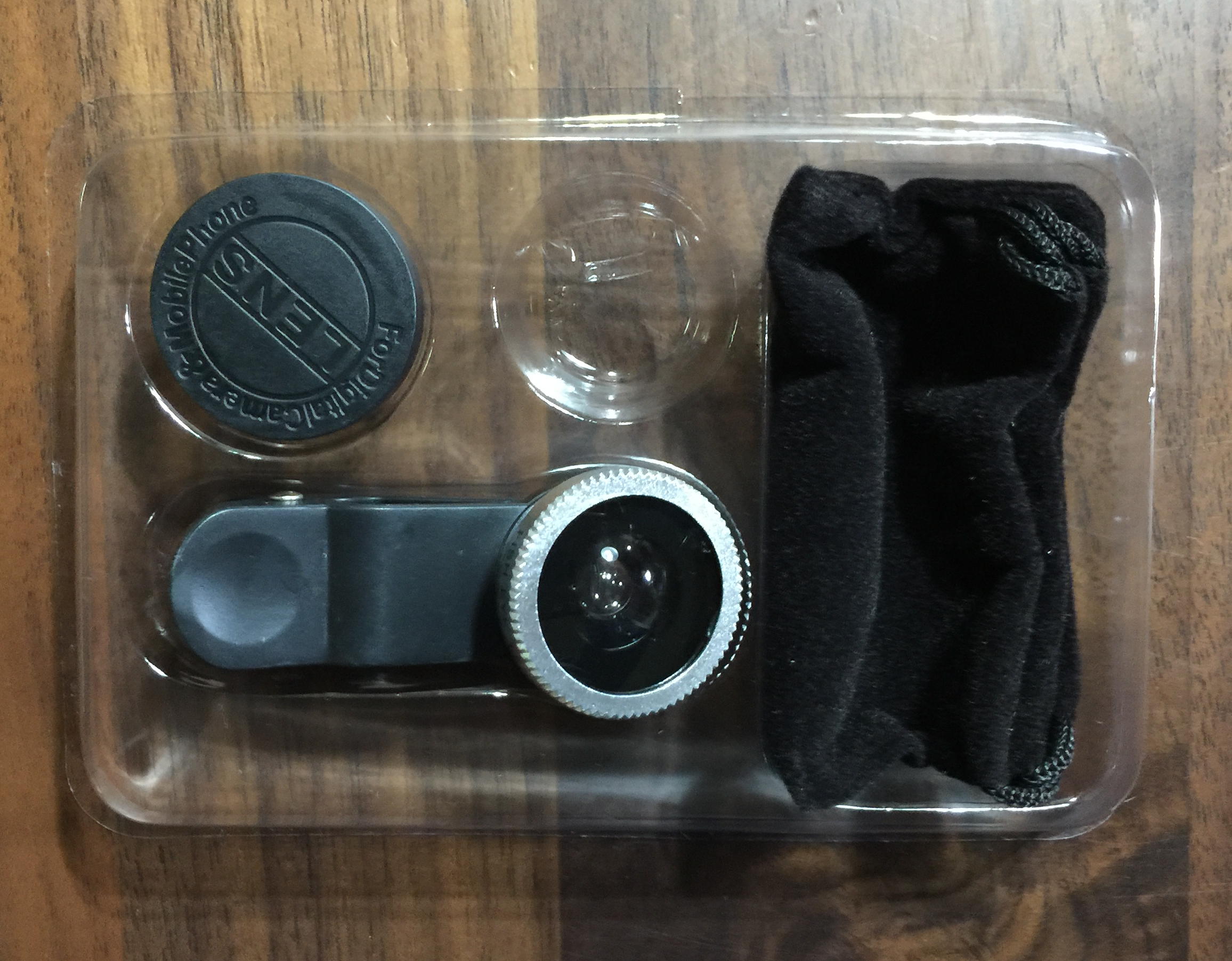 中には、レンズ本体(クリップ一体式)、レンズカバー、レンズ収容用巾着袋が同梱されていた。