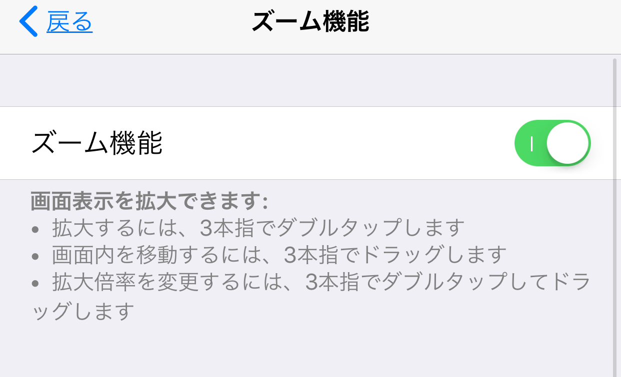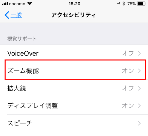 設定は、「設定」>「一般」>「アクセシビリティ」>「ズーム機能」をONに。